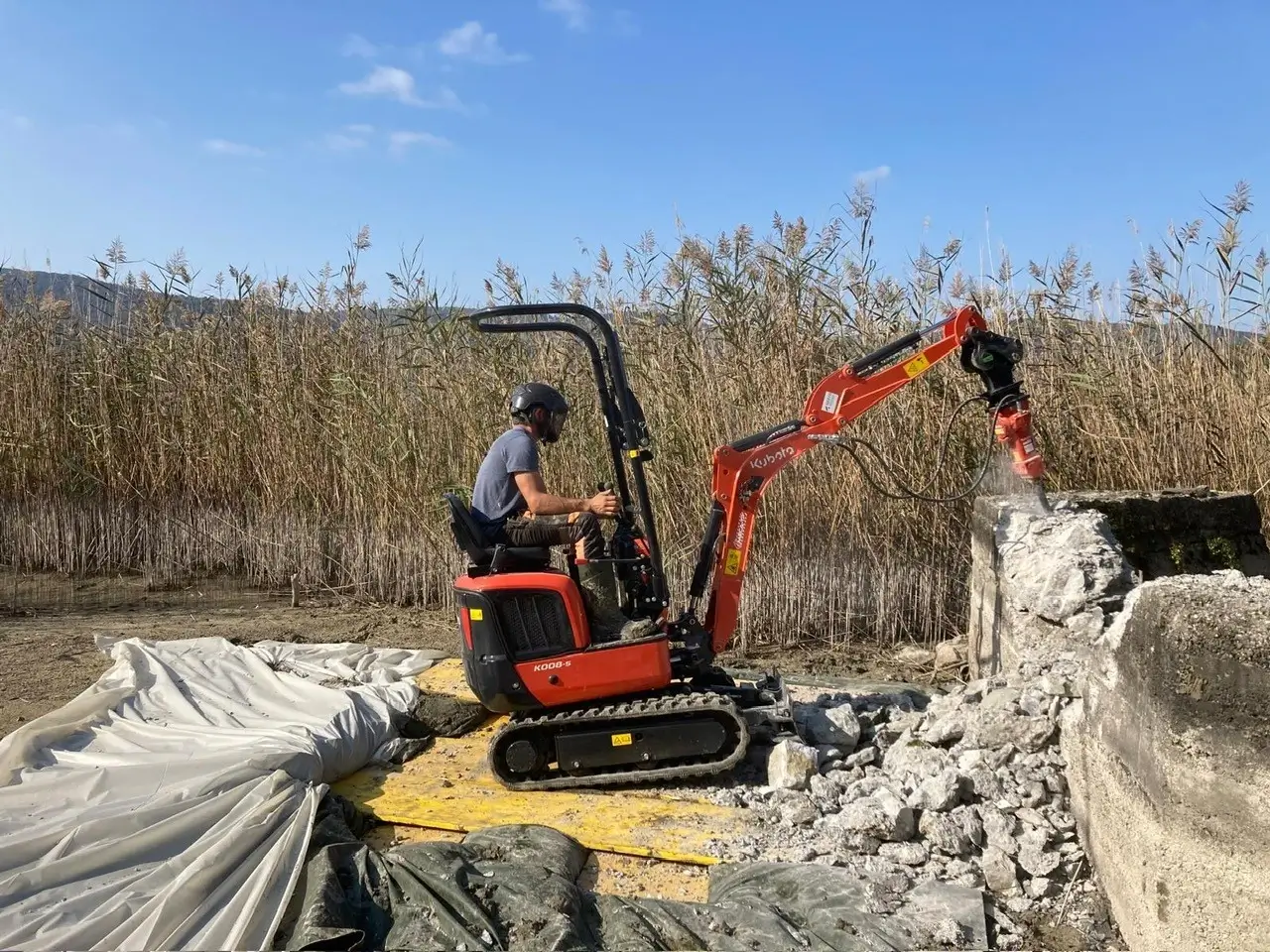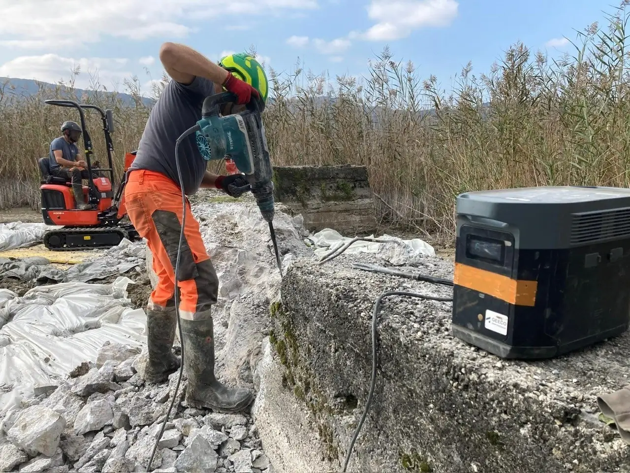 L’intervention a été menée dans des conditions exceptionnelles, durant une période d’étiage marqué du lac. L’accès au site s’est fait exclusivement par héliportage, en partenariat avec HDF – Hélicoptère de France. Les travaux ont mobilisé une micro-pelle équipée d’un BRH, fonctionnant avec des huiles et carburants biosourcés. La démolition a été réalisée sans produits chimiques ni carburants fossiles, afin de limiter au maximum l’impact sur l’environnement.